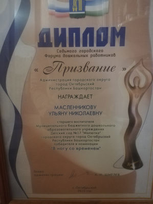 2015г. - Диплом администрации городского округа город Октябрьский Республики Башкортостан за победу на Седьмом городском Форуме дошкольных работников "Призвание" в номинации "В ногу со временем"